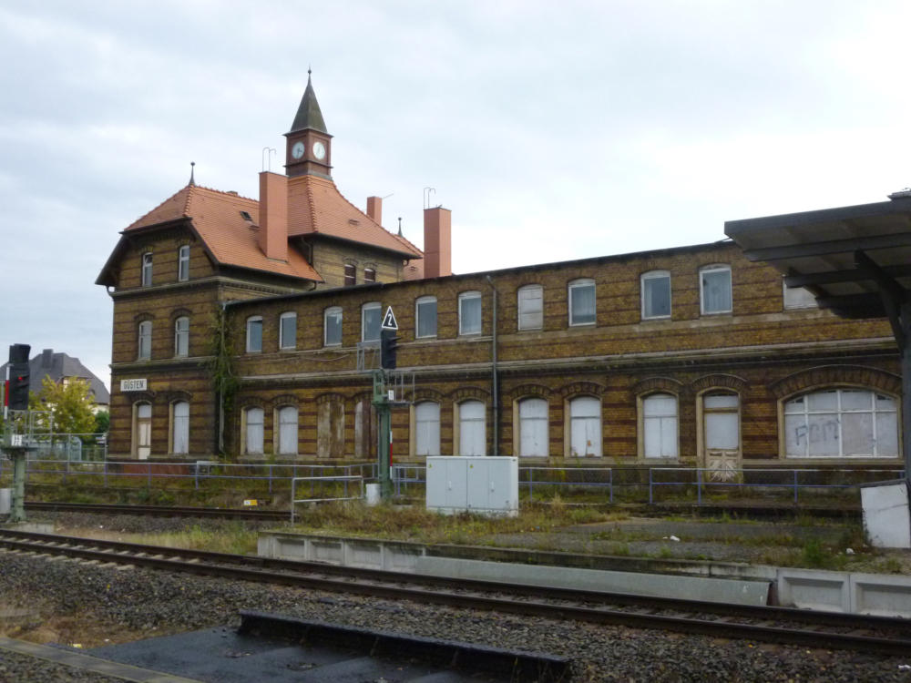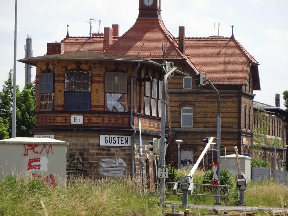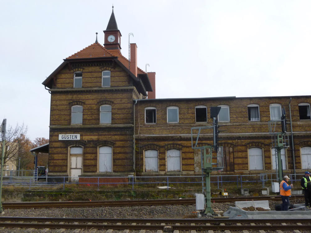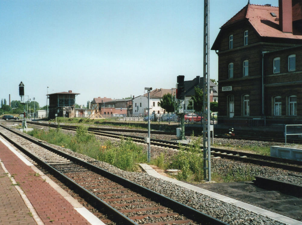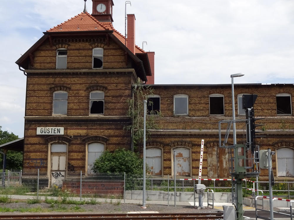 Der gesamte Bahnhof Güsten besteht nach dem Umbau nur noch aus zwei durchgehenden Haupt-gleisen und einem Stumpfgleis, wo noch Triebwagen wenden können. Es exestiert kein Überhol-gleis und damit keinerlei Möglichkeiten einer Zugkreuzung. Hier hat der Sparwahn der DeutschenBahn- AG voll zugeschlagen. Am 31.03.1995 wurde die Fahrkartenausgabe geschlossen. DasEmpfangsgebäude verfällt seitdem zusehens. Ab August 2000 wurde auf der Berliner Seite nachAbbau der Gleisanlagen ein Busbahnhof errichtet.